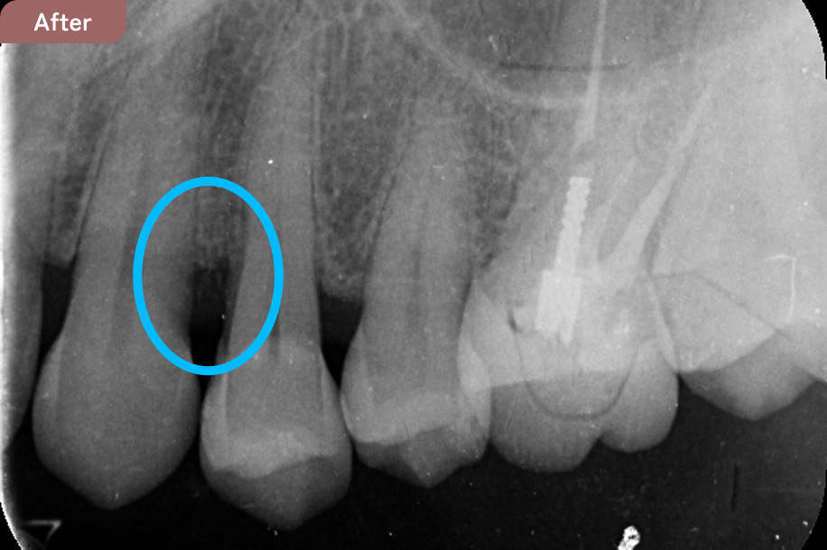 青丸の部分に再生療法を行った結果、骨の再生が認められる。