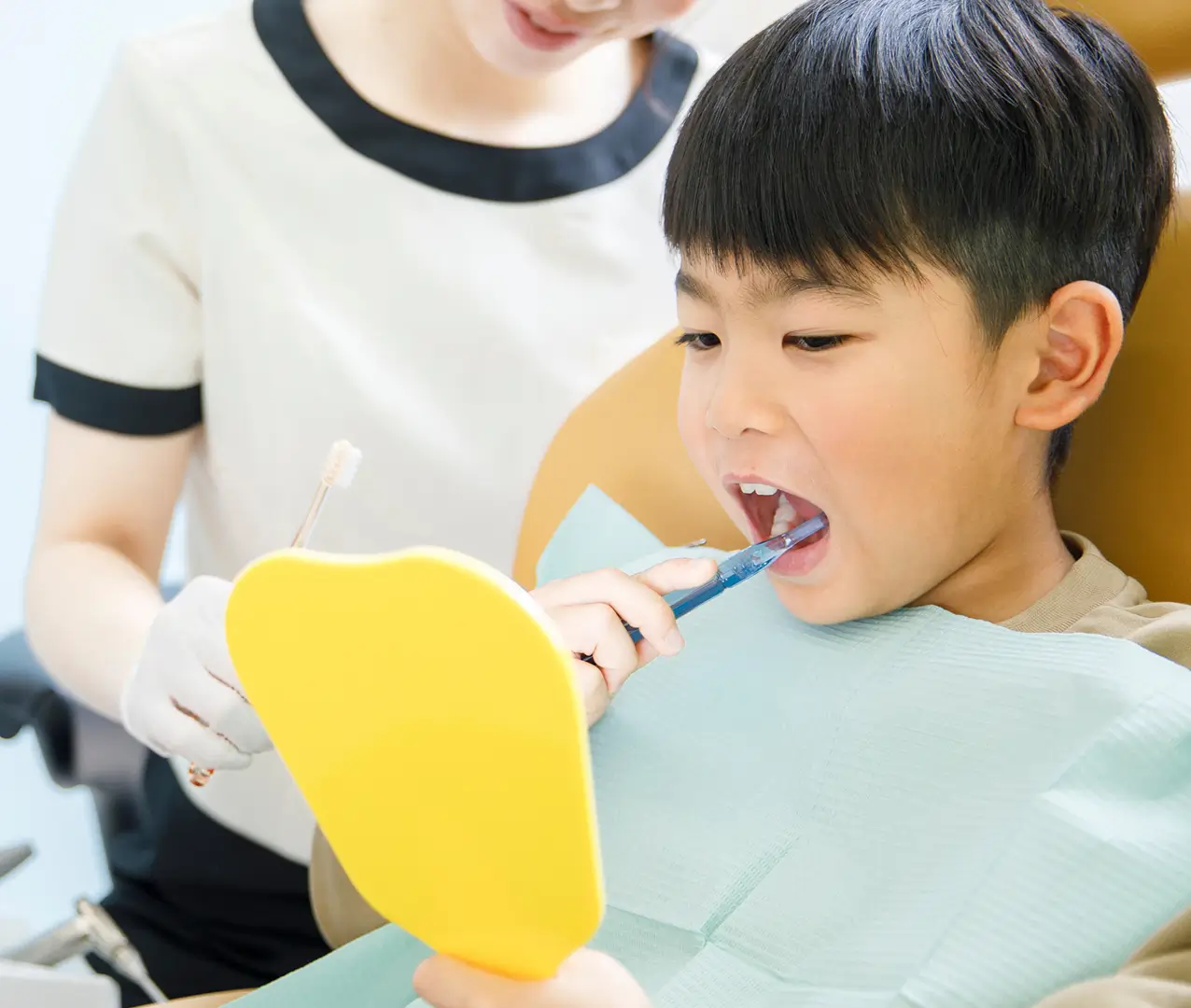 フッ素塗布で歯を強くするシーラント(奥歯の溝を埋める処置)で虫歯を防ぐ歯磨き指導でおうちケアのコツをサポートします。また、定期的なチェックで、乳歯から永久歯への生えかわりをしっかり見守ります。